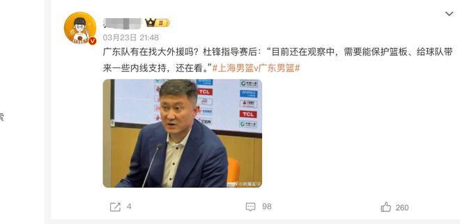 在赛后的采访当中,杜锋在总结总计球队出现了一些问题之后,也要点提到了外助这一方面的东说念主选。他爆料现时球队还在物色新的外助,但愿随机寻找新的大外助来匡助球队耕种内线方面的实力,保护好篮板。是以从杜锋透露的这个音问咱们不错了解到,朱芳雨他们其实正在接力的寻找全新相宜的大外助,匡助广东男篮处置内线的这一块短板。