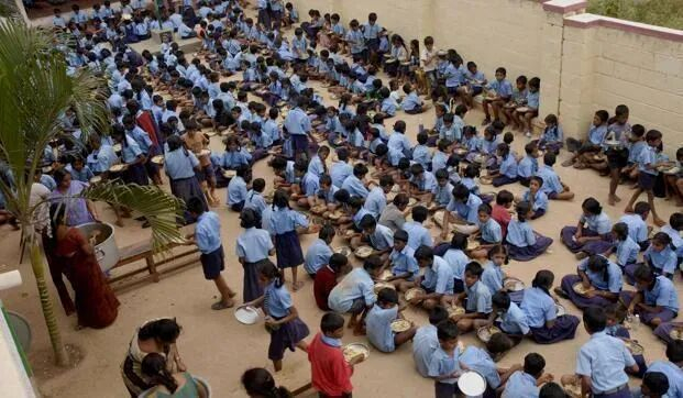 印度学生坐在节略的“操场”上吃午饭